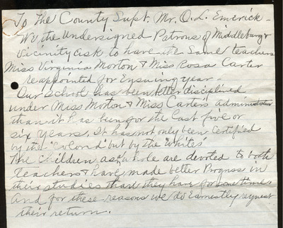 This letter dated May 10, 1932, from the Community League, patrons of the Colored Public School, and taxpayers in Loudoun County, Virginia, to the Board of Education, highlights a call for change in the graded departments of the school. The appeal for improvements in efficiency and other unspecified concerns reflects a desire for a better educational experience for the children attending the school. After thirty years without change, the community league and patrons are advocating for a justifiable plea to appoint teachers that will address their concerns and enhance the learning environment for their children.